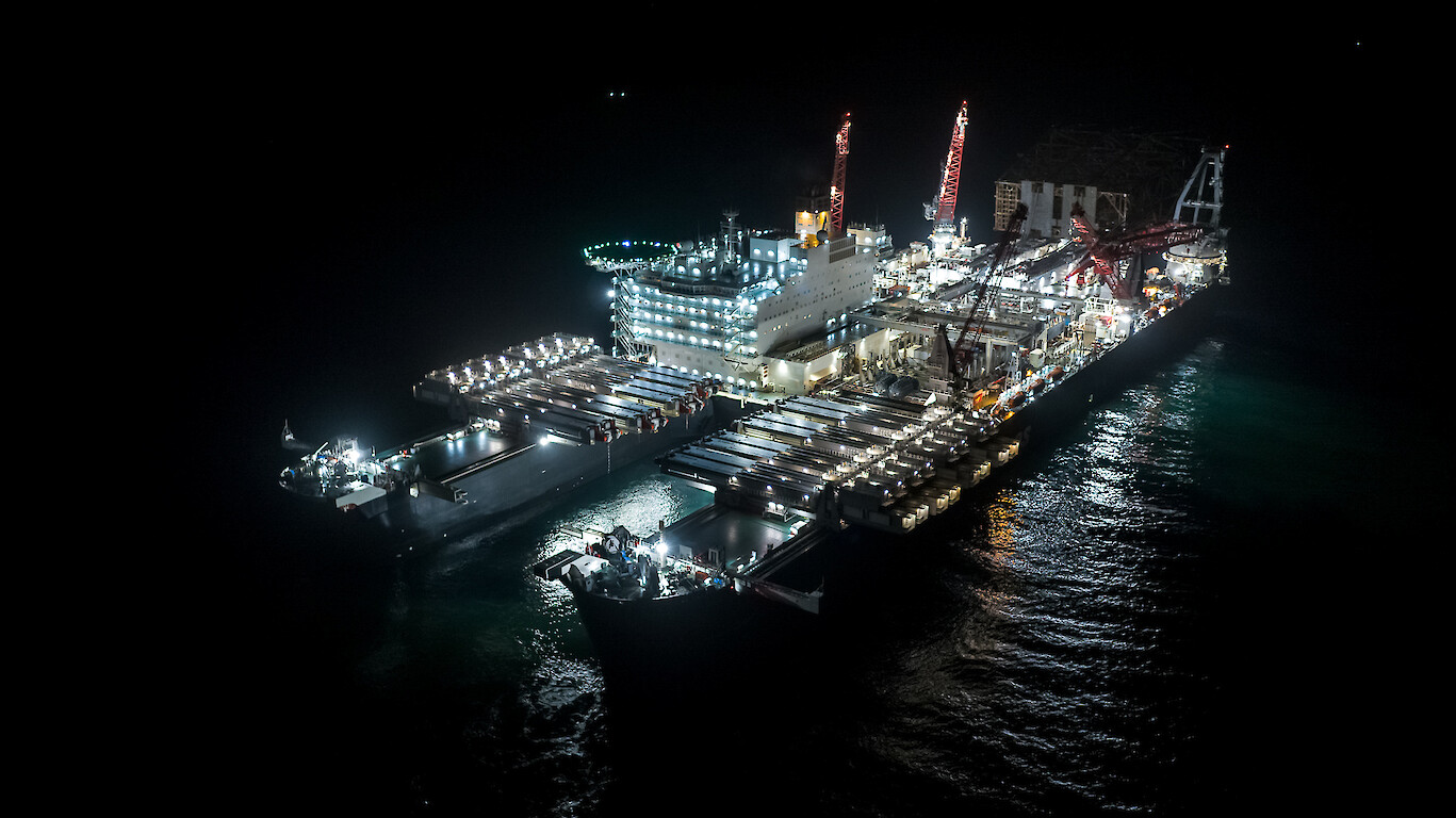 The operation also involves a fleet of support vessels, including tugs, a workboat and barges.
